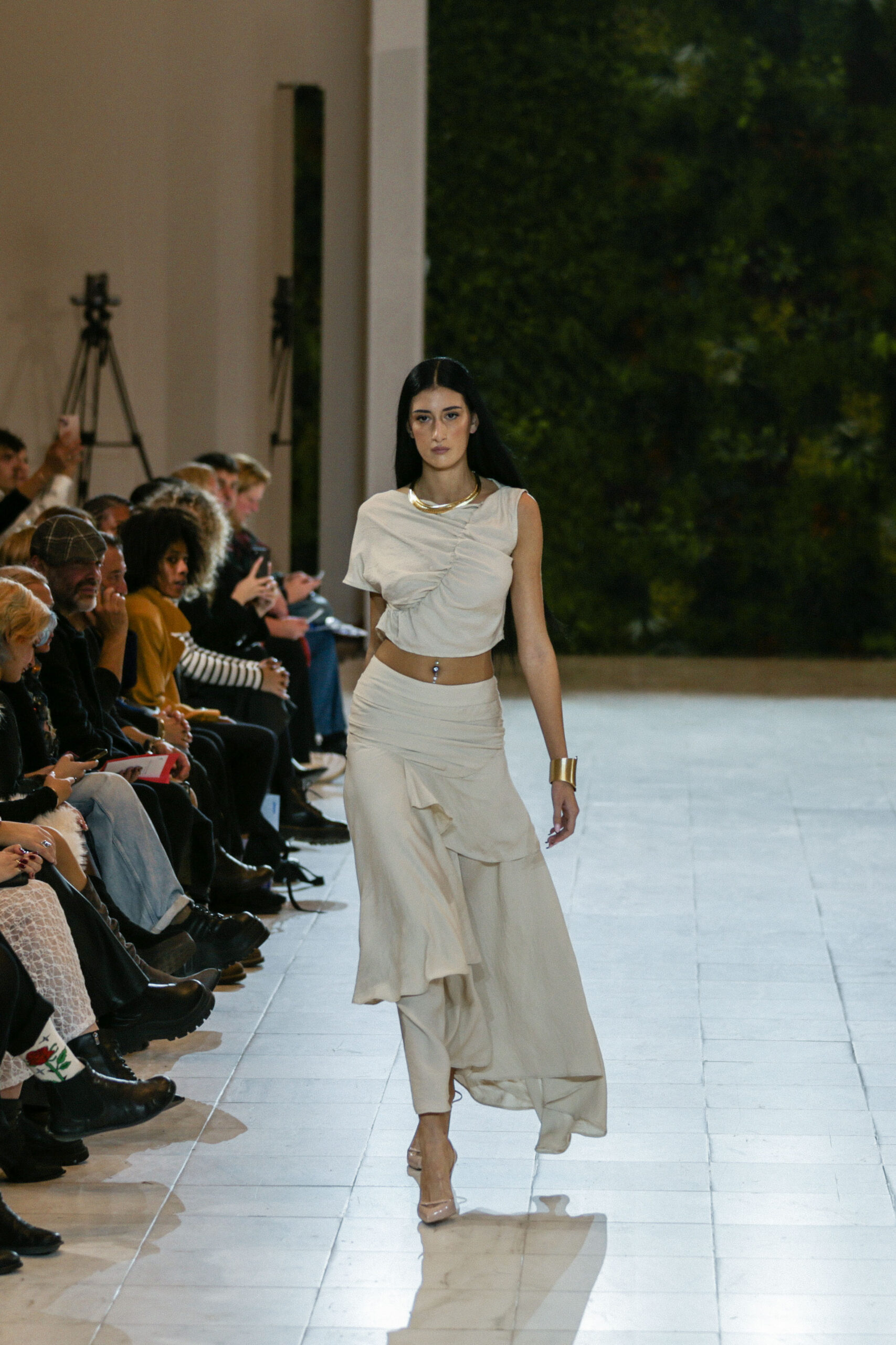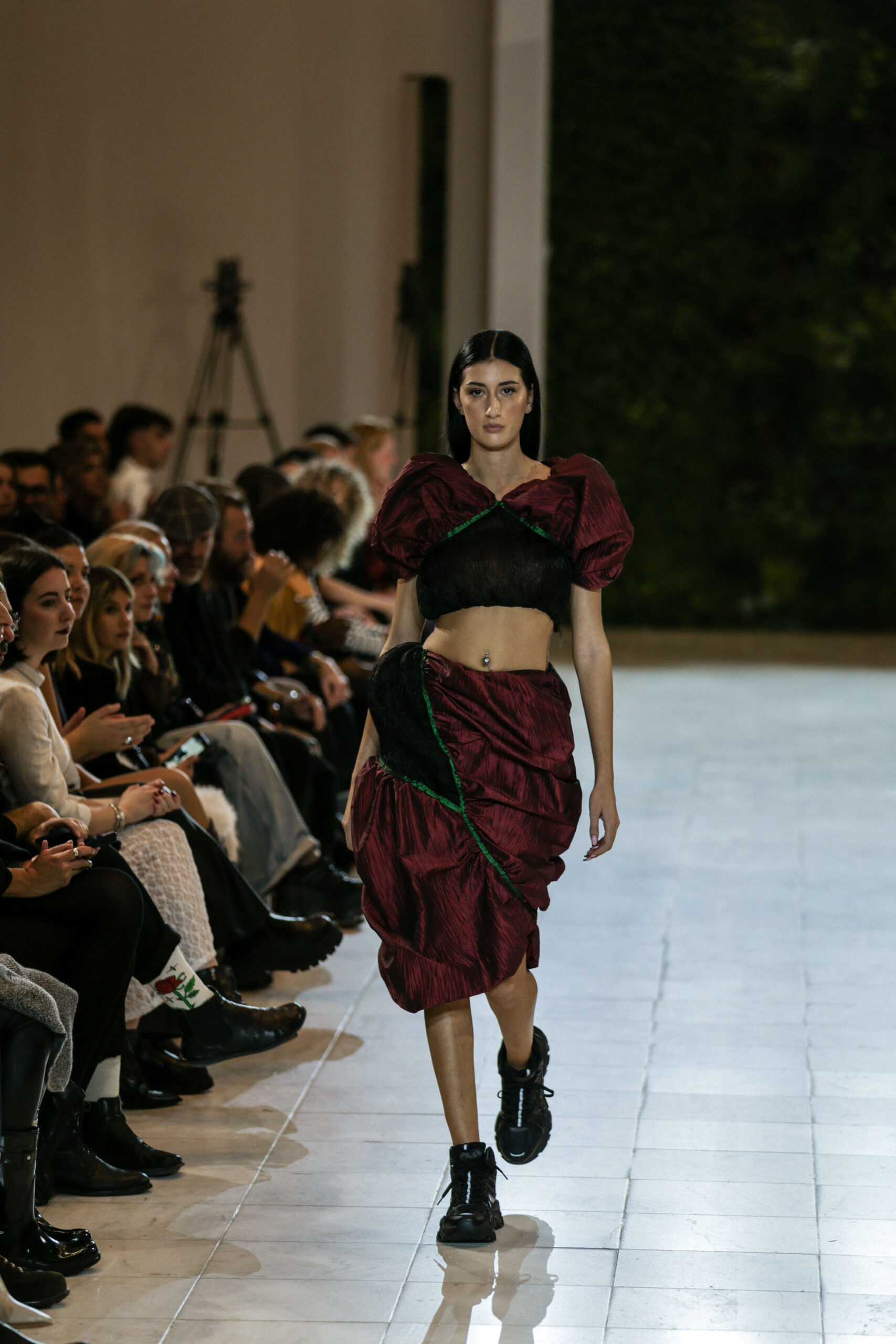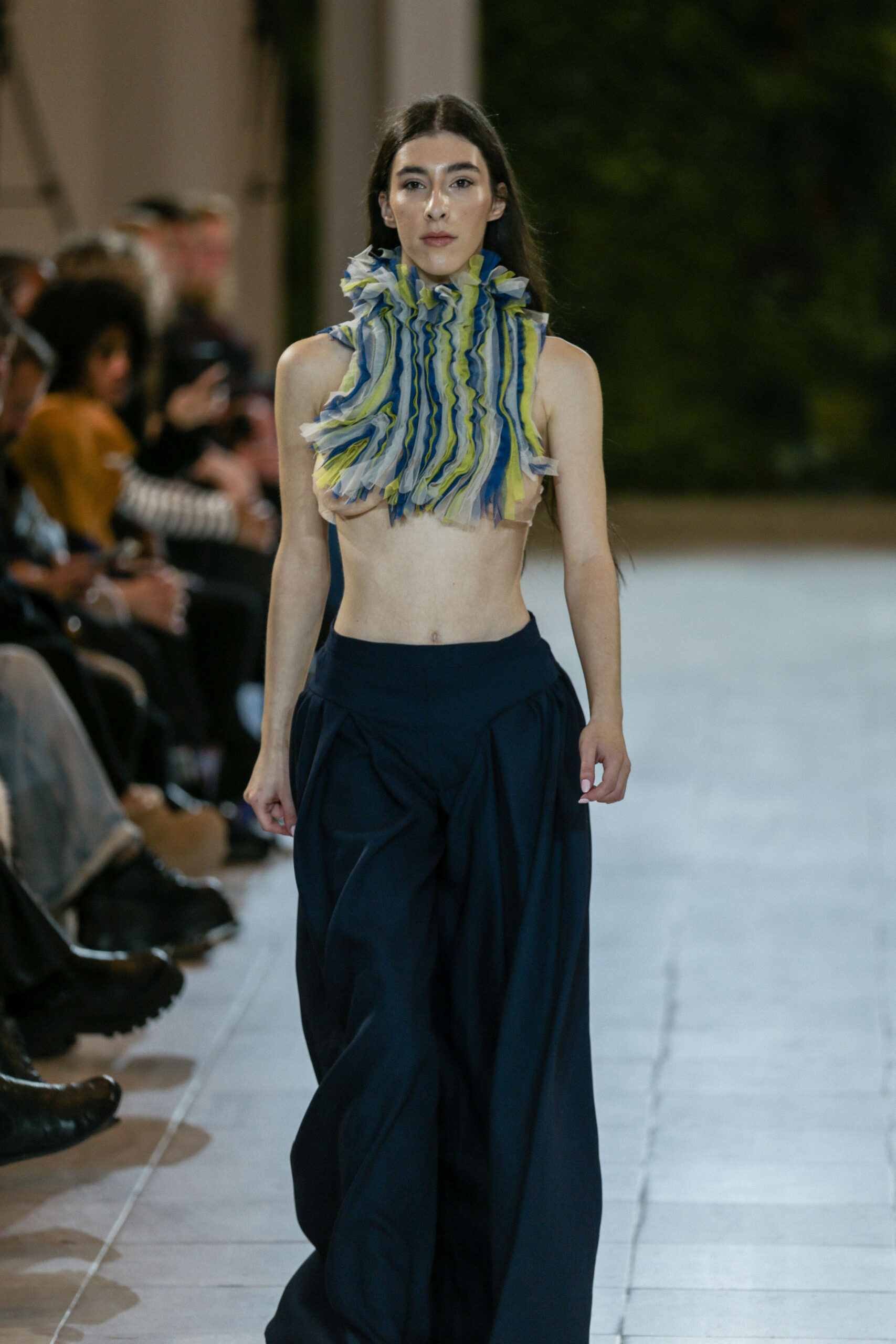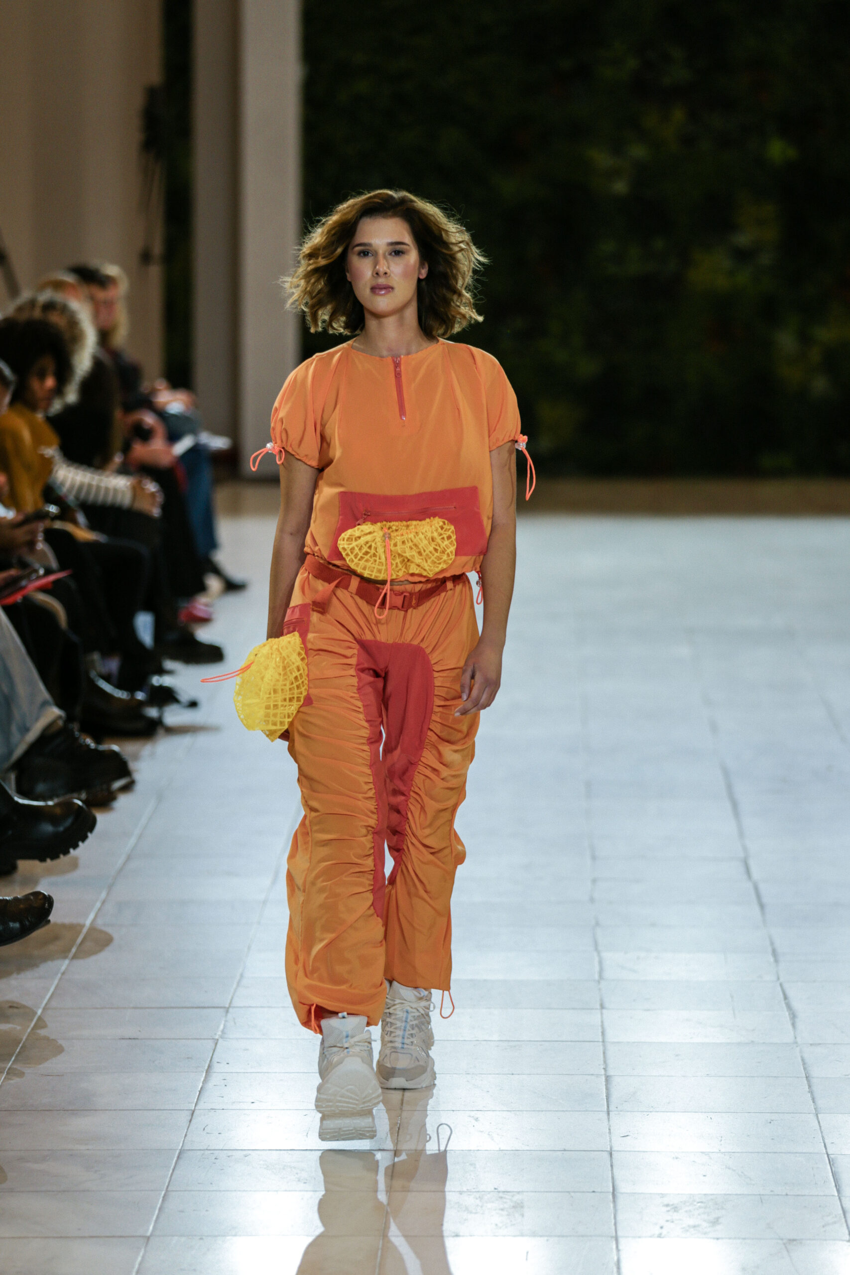 Στην κατάμεστη αίθουσα του catwalk, το κοινό είχε την ευκαιρία να ζήσει ένα “ταξίδι” πειραματισμού και αναζήτησης. Να δει πώς αντιλαμβάνονται τις σύγχρονες προκλήσεις τα μέλη της κοινότητας Fashion Design του AKTO καθώς και πώς πειραματίζονται κι εκφράζουν τη δημιουργικότητά τους, ενώ ακόμα βρίσκονται στο 2ο έτος σπουδών. Το show περιλάμβανε δύο ενότητες: