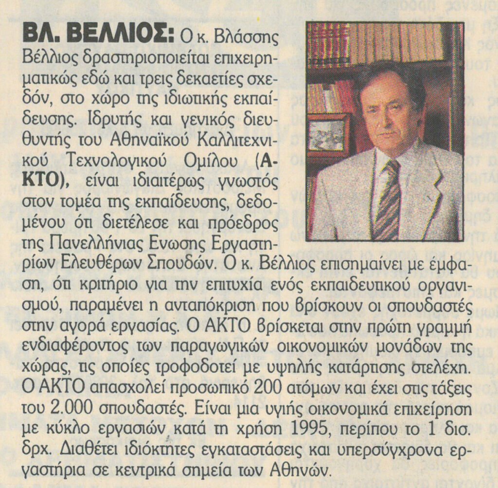 Η ευθύνη λοιπόν, για όσους διαχειρίζονται έναν τέτοιο ρόλο στην εκπαίδευση είναι μεγάλη. Έχοντας απόλυτη συναίσθηση του μεγέθους της ευθύνης αυτής, οδηγήσαμε τον ΑΚΤΟ σε αυτό το υψηλότατο επίπεδο σπουδών που συναντά επί 50 και πλέον χρόνια τώρα, τις απαιτήσεις της σύγχρονης αντίληψης για την εκπαίδευση. Το υψηλό αυτό επίπεδο σπουδών έχει γίνει αντιληπτό από την αγορά εργασίας μέλη της οποίας κάθε χρόνο, απευθύνονται στον ΑΚΤΟ και προσφέρουν εκατοντάδες θέσεις εργασίας στους αποφοίτους.